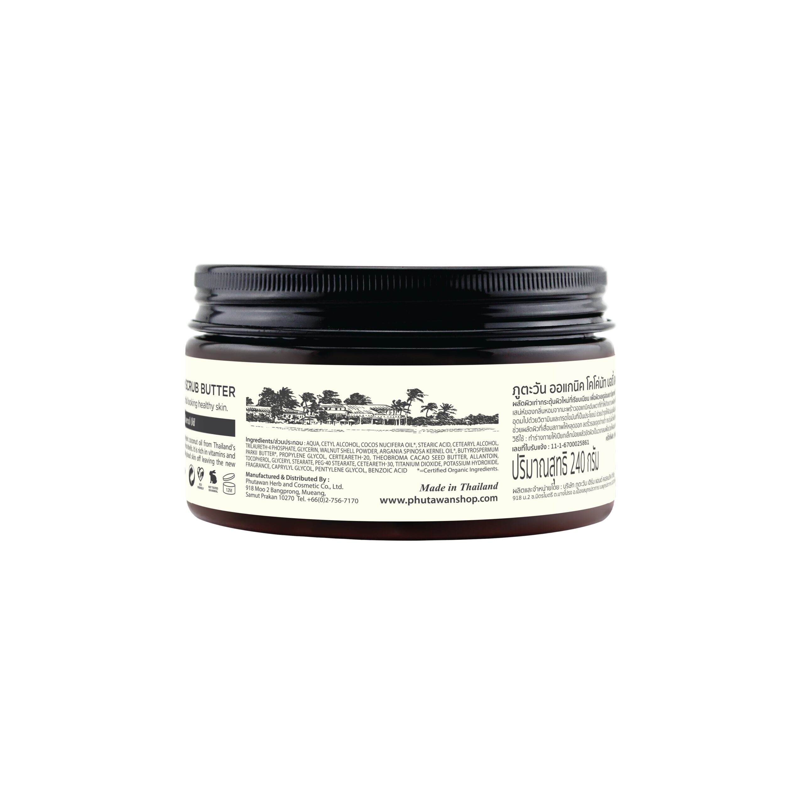 Ingredients: AQUA, CETYL ALCOHOL, COCOS NUCIFERA OIL, STEARIC ACID, CETEARYL ALCOHOL, TRILAURETH-4 PHOSPHATE, GLYCERIN, WALNUT SHELL POWDER, ARGANIA SPINOSA KERNEL OIL, BUTYROSPERMUM PARKII BUTTER, PROPYLENE GLYCOL, CETEARETH-20, THEOBROMA CACAO SEED BUTTER, ALLANTOIN, TOCOPHEROL, GLYCERYL STEARATE, PEG-40 STEARATE, CETEARETH-30, TITANIUM DIOXIDE, POTASSIUM HYDROXIDE, FRAGRANCE, CAPRYLYL GLYCOL, PENTYLENE GLYCOL, BENZOIC ACID.