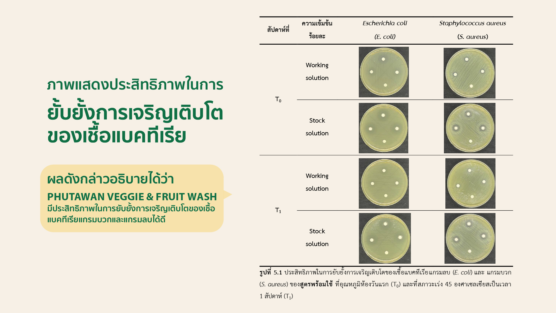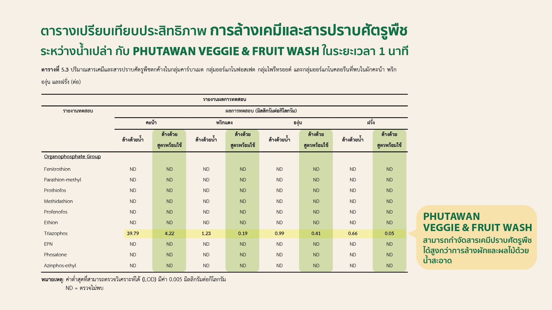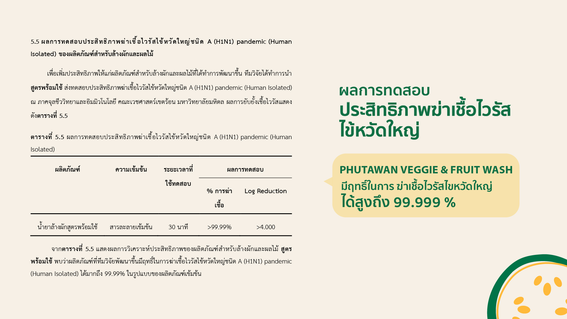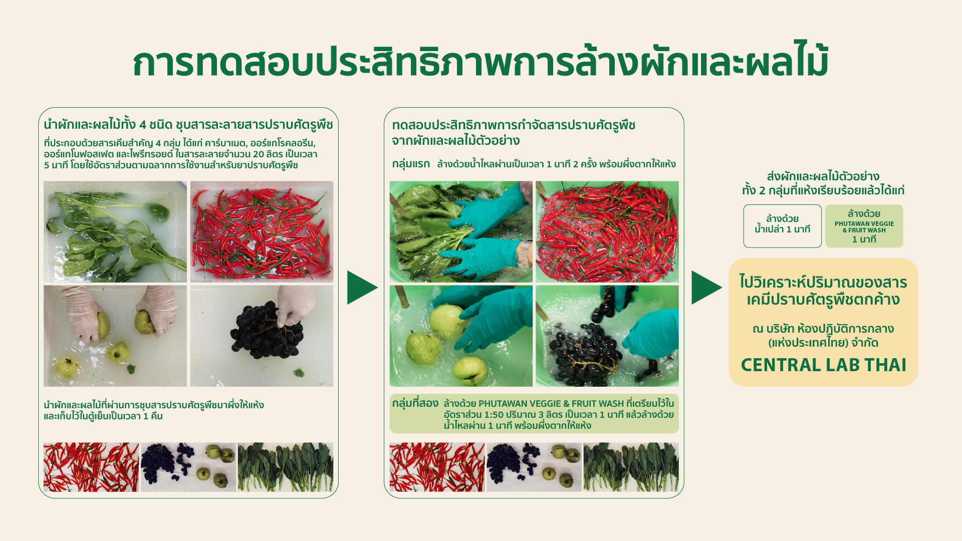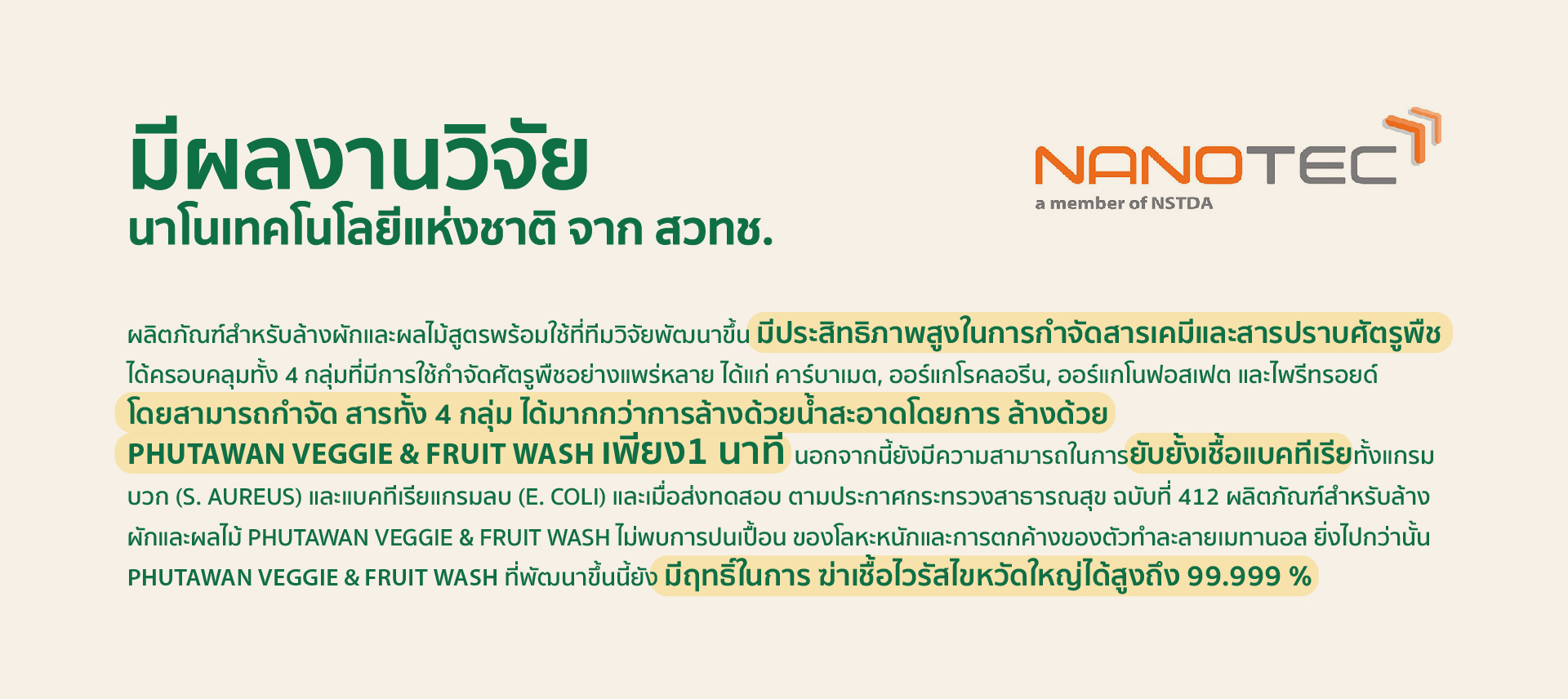 ผลิตภัณฑ์สำหรับล้างผักและผลไม้สูตรพร้อมใช้ที่ทีมวิจัยพัฒนาขึ้น มีประสิทธิภาพสูงในการกำจัดสารเคมีและสารปราบศัตรูพืชได้ครอบคลุมทั้ง 4 กลุ่มที่มีการใช้กำจัดศัตรูพืชอย่างแพร่หลาย ได้แก่ คาร์บาเมต, ออร์แกรคลอรีน, ออร์แกโนฟอสเฟต และไพรีทรอยด์ โดยสามารถกำจัดสารทั้ง 4 กลุ่ม ได้มากกว่าการล้างด้วยน้ำสะอาดโดยการ ล้างด้วย PHUTAWAN VEGGIE & FRUIT WASH เพียง 1 นาที นอกจากนี้ยังมีความสามารถในการยับยั้งเชื้อแบคทีเรียทั้งแกรมบวก (S. AUREUS) และแบคทีเรียแกรมลบ (E. COLI) และเมื่อส่งทดสอบ ตามประกาศกระทรวงสาธารณสุข ฉบับที่ 412 ผลิตภัณฑ์สำหรับล้างผักและผลไม้ PHUTAWAN VEGGIE & FRUIT WASH ไม่พบการปนเปื้อน ของโลหะหนักและการตกค้างของตัวทำละลายเมทานอล ยิ่งไปกว่านั้น PHUTAWAN VEGGIE & FRUIT WASH ที่พัฒนาขึ้นนี้ยัง มีฤทธิ์ในการ ฆ่าเชื้อไวรัสไขหวัดใหญ่ได้สูงถึง 99.999%